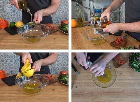 To the bowl with the citrus juices and zest, add the balsamic vinegar, honey, and Dijon mustard. Also add the salt and black pepper. Now, slowly pour in the olive oil.
