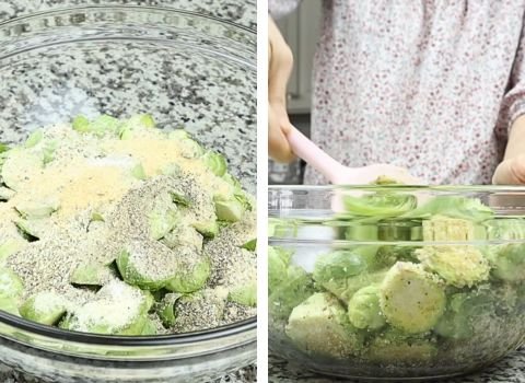 - Place the sprouts in a large mixing bowl. Add the olive oil, Parmesan cheese, breadcrumbs, garlic powder, salt, and pepper. Toss everything until each sprout is coated.