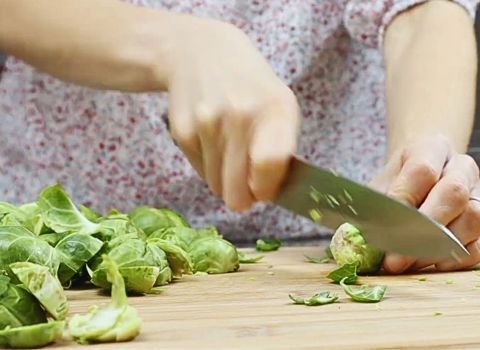 Wash them well, trim off the tough stem ends, and cut each sprout in half. If some are very large, cut them into quarters so they cook evenly.